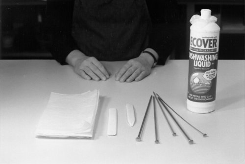 Assemble the following: Polyvinyl Acetate Adhesive (PVA) in a tall thin container, knitting needles or plastic rods of various thickness, waxed paper, and a bone folder. A book press and metal-edged boards (or appropriate substitutes) will also be needed.