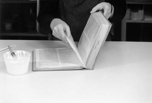 Place a sheet of waxed paper into the gutter between the insert and the page before it to protect the text block from excess adhesive.