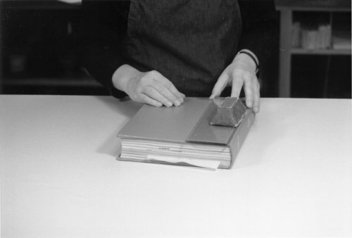Close the book. Place a pressing board or glass plate along the spine edge and set a weight on top. Let stand for several hours.