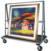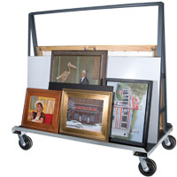 Image of cart with small paintings (right) is shown using Volara foam as a base pad and Coroplast corrugated sheets as a support.